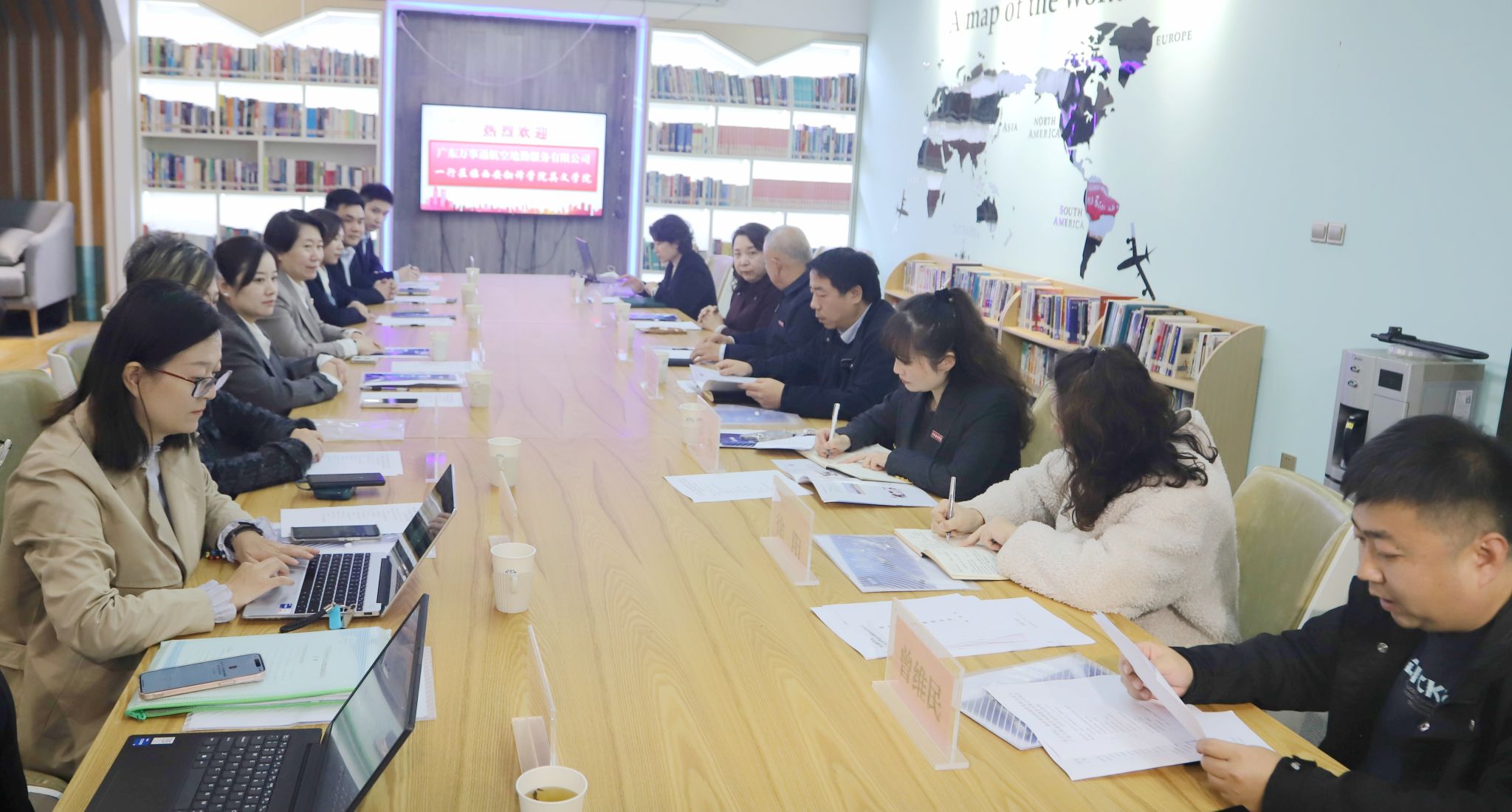 为进一步加强校企合作,实现教育资源与社会资源的优化配置,深化产教融合,共同推进协同育人新篇章,11月12日下午,我校英文学院、陕西颖创跨境贸易研究院与广东万事通航空地勤服务有限公司举行校企合作签约仪式。广东万事通航空地勤服务有限公司理事长李冰等企业领导及我校英文学院院长,陕西颖创跨境贸易研究院院长王淙及学院相关领导出席会议。英文学院综合办副主任曾维民主持会议。