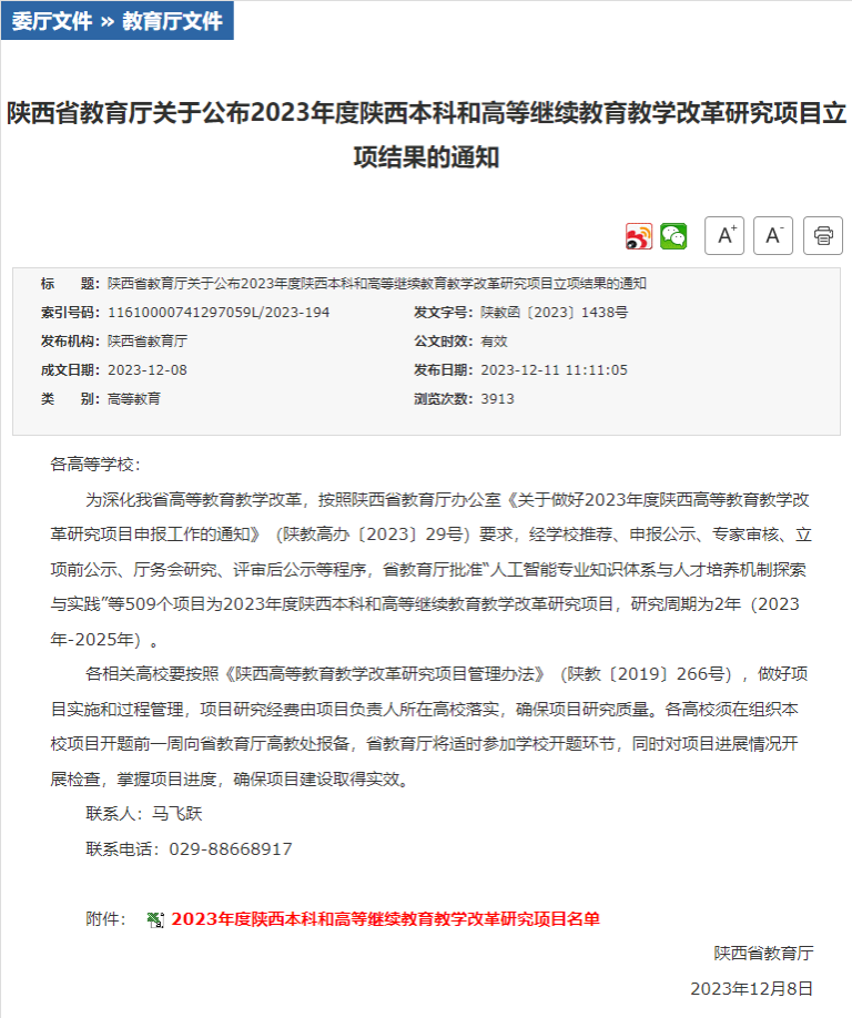 近日,陕西省教育厅办公室发布《关于公布2023年度陕西本科和高等继续教育教学改革研究项目立项结果的通知》(陕教函〔2023〕1438号),我校有7个项目获批立项,其中重点攻关项目1项,重点项目(含青年专项)3项和一般项目3项。此次我校省级教改立项数量和质量双双在同类民办院校中排名第一。