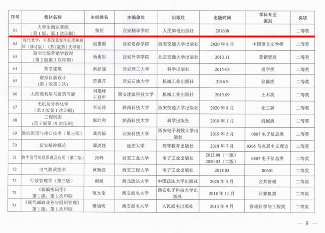 近日,陕西省教育厅办公室印发了《关于公布2020年陕西普通高等学校优秀教材获奖名单的通知》(陕教材办〔2021〕1号),由西安翻译学院党委副书记、副校长张恒主编的《大学生创业基础》教材喜获陕西省普通高等学校优秀教材二等奖。