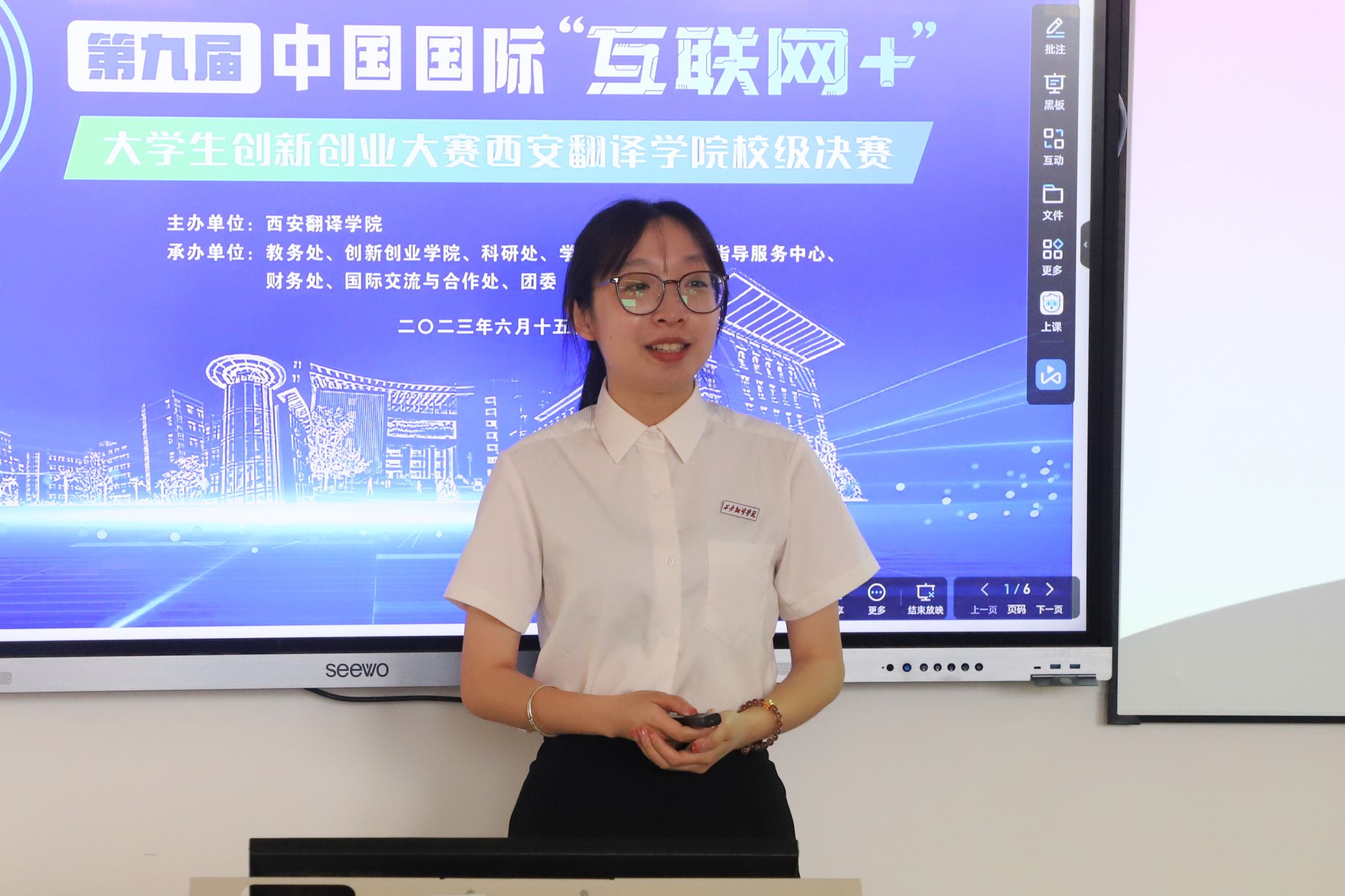 为进一步激发西译青年学子创新创业热情,6月15日,我校举行第九届中国国际“互联网+”大学生创新创业大赛校级决赛。比赛主题为“我敢闯,我会创”。校长崔智林观摩比赛。副校长兼教务长齐玉水,党委副书记、副校长张恒,教务处处长秦晓梅以及有着丰富“互联网+”比赛指导经验的专家评审团担任大赛评委。